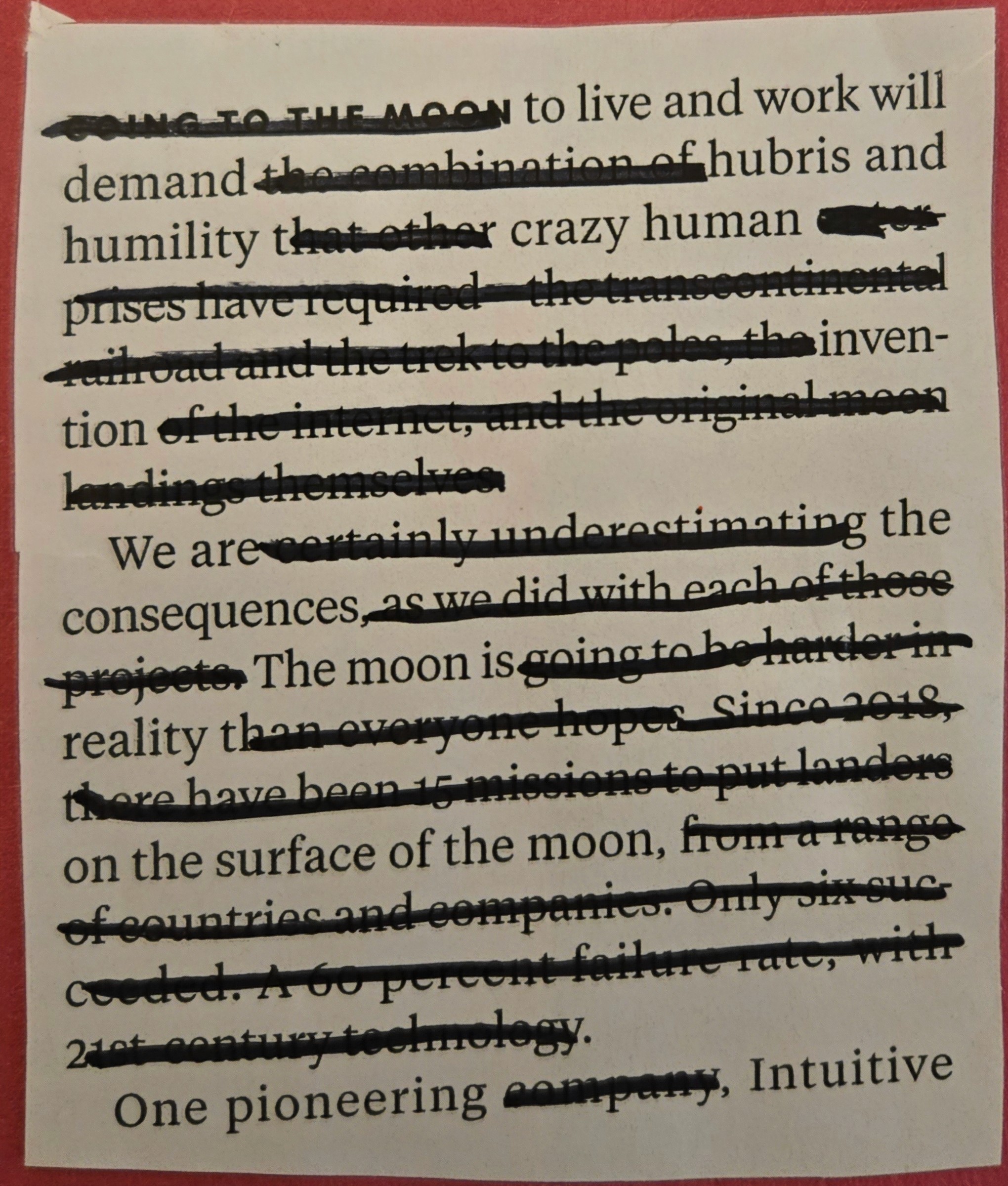 future (life on the moon), the artist brings forth a new text situated in a perennial now, grappling with what survives of our stories when we strip away the dominant narrative. The poem asks us to imagine futures not through exploitation and extraction but through wonder and relationship, and it demonstrates what that might feel like by making us attend closely to each remaining word, space, and