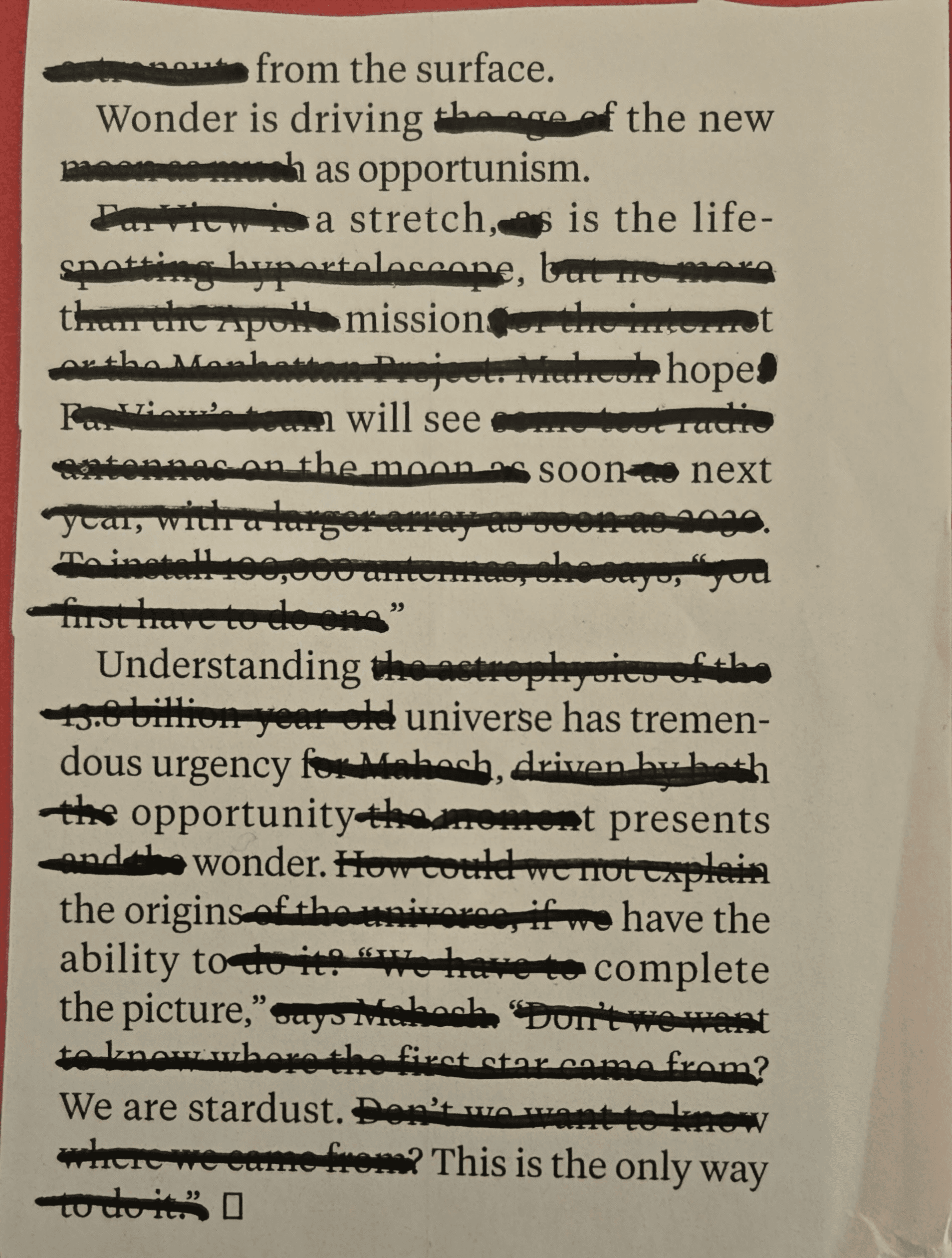 “Presencing (Whatever Survives)” is an erasure of two National Geographic articles (September 2025): one about ancient Galápagos tortoises and another about humanity’s ambitions to live and work on the moon. The juxtaposition of invokes questions of colonialism and futurity with the agency of the tortoise, its mere enduring presence, standing as a quiet counterpoint to human enterprise. The poem asks how our visions of the future might break from the colonial past. It brings this question into focus by literally placing an Earth-bound story (the tortoise, an emblem of longevity and ecological wisdom) beside a space-bound story (the moon, an emblem of human technological aspirations).
