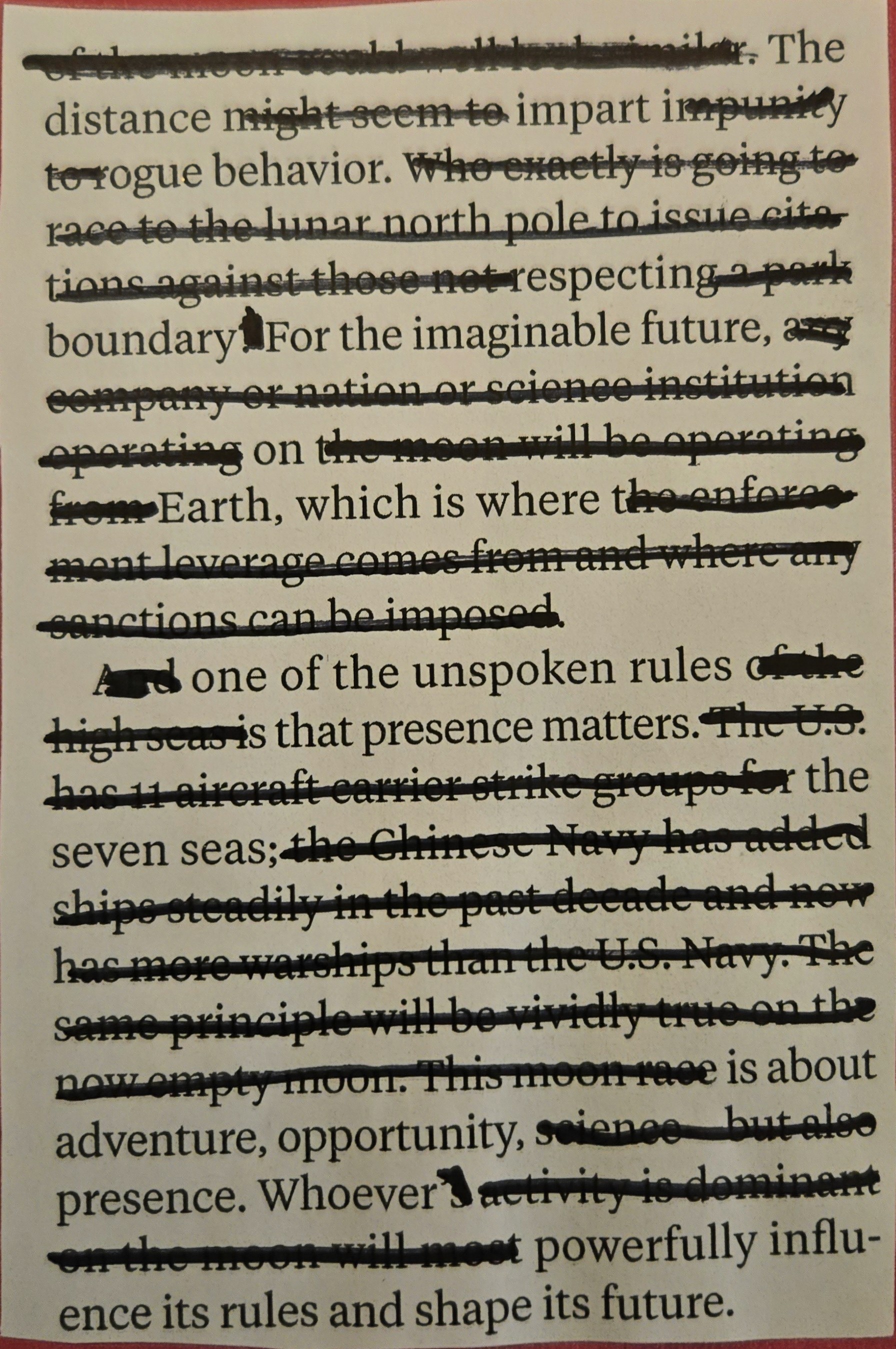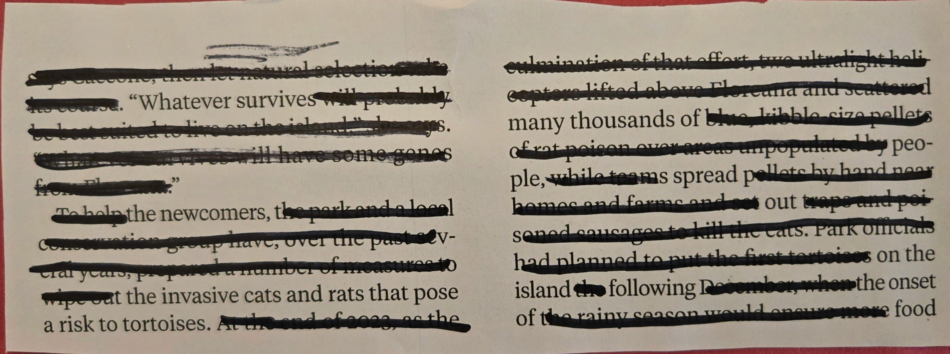 colonial past. It brings this question into focus by literally placing an Earth-bound story (the tortoise, an emblem of longevity and ecological wisdom) beside a space-bound story (the moon, an emblem of human technological aspirations).The poem’s very form suggests that our future might be better perceived through careful attention to what has been erased and what has survived, rather than from narratives of conquest and control. The preserved words and fragments remain in their original location, clustered in dense phrases or isolated as a single word surrounded by white space, to create a visual rhythm that conveys both connection and fragmentation.As such, the work resists a single authoritative narrative. Meaning is collaboratively produced by the original texts, the artist, and the reader who interprets the fragments. The authority of National Geographic’s articles, one shaping our view of conservation, the other shaping our exploration of space, is gently subverted through a democratized re-reading. By erasing and combining these texts about the past (ancient tortoises) and the